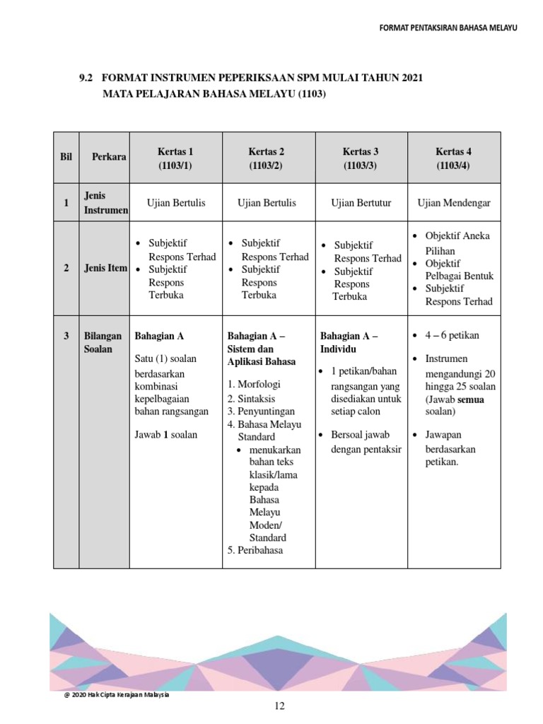 Format Pentaksiran Bahasa Melayu Kod 1103 Spm Mulai 2021